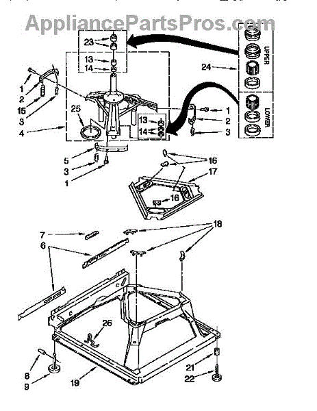Used for direct drive washing machines. Complete assembly includes 2 level mechanism links, 1 level mechanism spring, 1 knurled pin, 2 rear feet, 1 pad plate, 1 suspension plate, 1 base pad, and 1 suspension spring retainer.