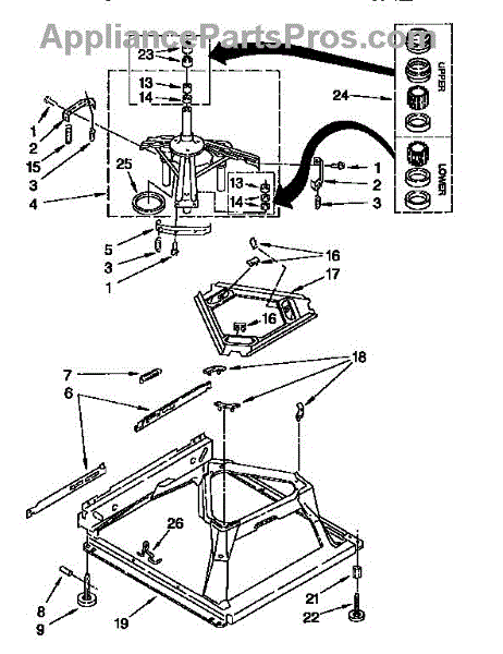 Used for direct drive washing machines. Complete assembly includes 2 level mechanism links, 1 level mechanism spring, 1 knurled pin, 2 rear feet, 1 pad plate, 1 suspension plate, 1 base pad, and 1 suspension spring retainer.