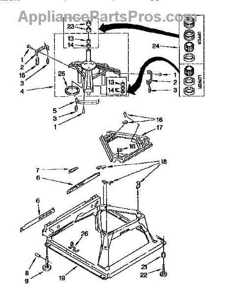Used for direct drive washing machines. Complete assembly includes 2 level mechanism links, 1 level mechanism spring, 1 knurled pin, 2 rear feet, 1 pad plate, 1 suspension plate, 1 base pad, and 1 suspension spring retainer.