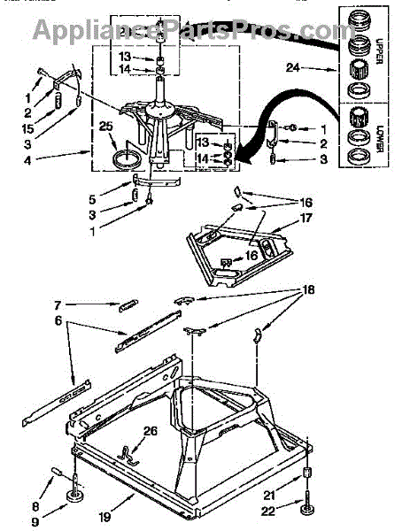 Used for direct drive washing machines. Complete assembly includes 2 level mechanism links, 1 level mechanism spring, 1 knurled pin, 2 rear feet, 1 pad plate, 1 suspension plate, 1 base pad, and 1 suspension spring retainer.