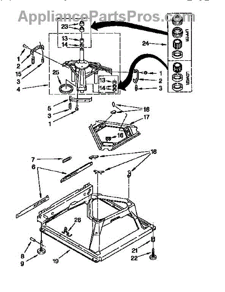 Used for direct drive washing machines. Complete assembly includes 2 level mechanism links, 1 level mechanism spring, 1 knurled pin, 2 rear feet, 1 pad plate, 1 suspension plate, 1 base pad, and 1 suspension spring retainer.