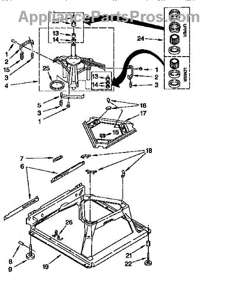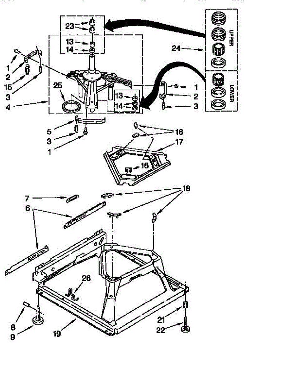 Used for direct drive washing machines. Complete assembly includes 2 level mechanism links, 1 level mechanism spring, 1 knurled pin, 2 rear feet, 1 pad plate, 1 suspension plate, 1 base pad, and 1 suspension spring retainer.