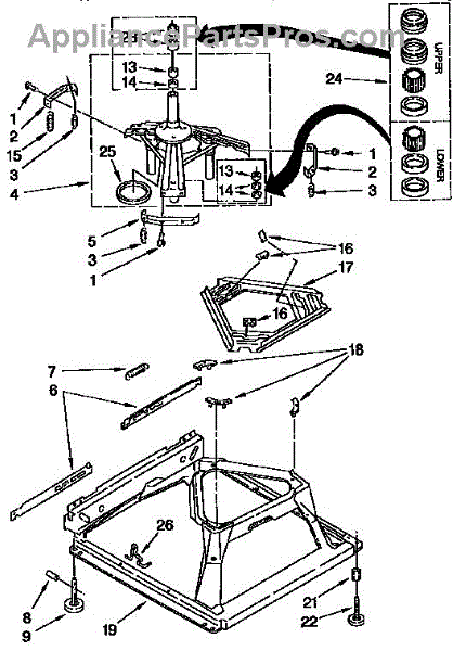 Used for direct drive washing machines. Complete assembly includes 2 level mechanism links, 1 level mechanism spring, 1 knurled pin, 2 rear feet, 1 pad plate, 1 suspension plate, 1 base pad, and 1 suspension spring retainer.