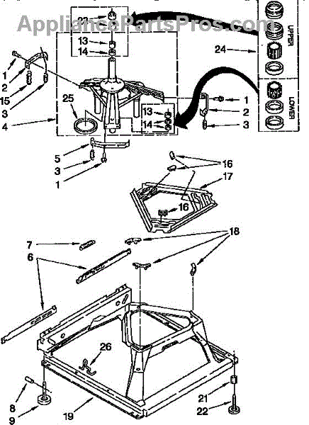 Used for direct drive washing machines. Complete assembly includes 2 level mechanism links, 1 level mechanism spring, 1 knurled pin, 2 rear feet, 1 pad plate, 1 suspension plate, 1 base pad, and 1 suspension spring retainer.