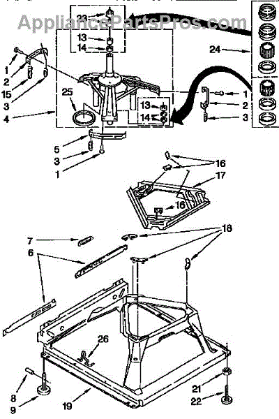 Used for direct drive washing machines. Complete assembly includes 2 level mechanism links, 1 level mechanism spring, 1 knurled pin, 2 rear feet, 1 pad plate, 1 suspension plate, 1 base pad, and 1 suspension spring retainer.