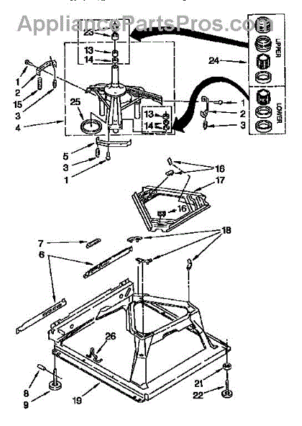 Used for direct drive washing machines. Complete assembly includes 2 level mechanism links, 1 level mechanism spring, 1 knurled pin, 2 rear feet, 1 pad plate, 1 suspension plate, 1 base pad, and 1 suspension spring retainer.