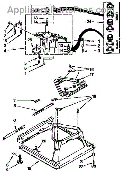 Used for direct drive washing machines. Complete assembly includes 2 level mechanism links, 1 level mechanism spring, 1 knurled pin, 2 rear feet, 1 pad plate, 1 suspension plate, 1 base pad, and 1 suspension spring retainer.