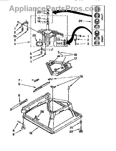 Used for direct drive washing machines. Complete assembly includes 2 level mechanism links, 1 level mechanism spring, 1 knurled pin, 2 rear feet, 1 pad plate, 1 suspension plate, 1 base pad, and 1 suspension spring retainer.