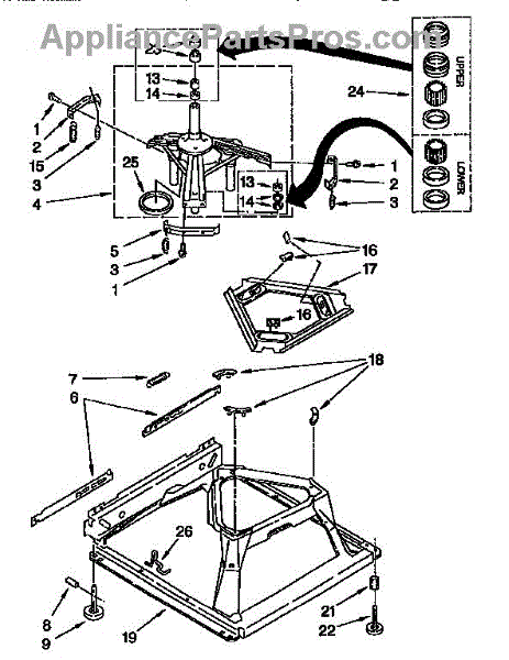 Used for direct drive washing machines. Complete assembly includes 2 level mechanism links, 1 level mechanism spring, 1 knurled pin, 2 rear feet, 1 pad plate, 1 suspension plate, 1 base pad, and 1 suspension spring retainer.
