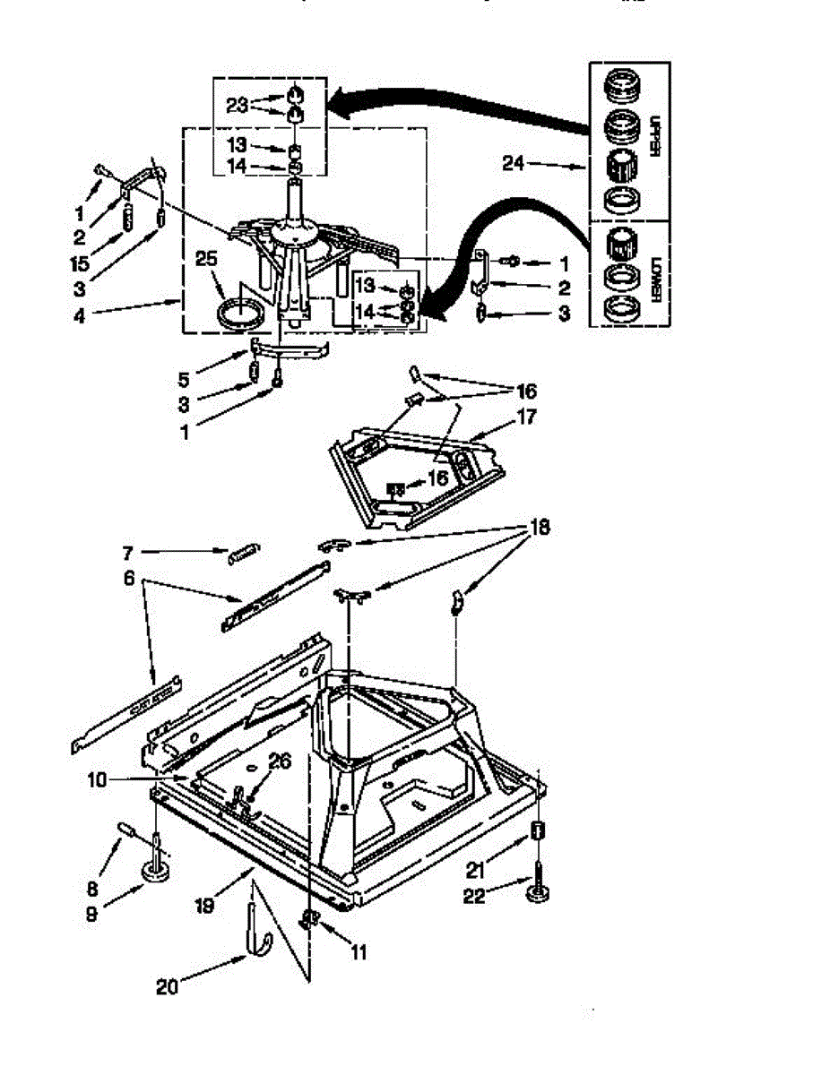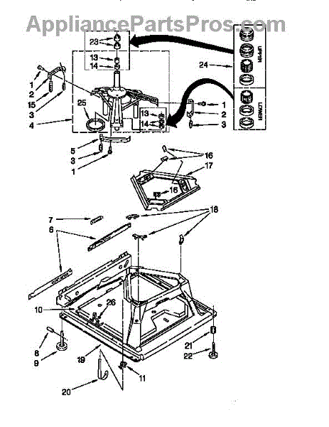 Used for direct drive washing machines. Complete assembly includes 2 level mechanism links, 1 level mechanism spring, 1 knurled pin, 2 rear feet, 1 pad plate, 1 suspension plate, 1 base pad, and 1 suspension spring retainer.