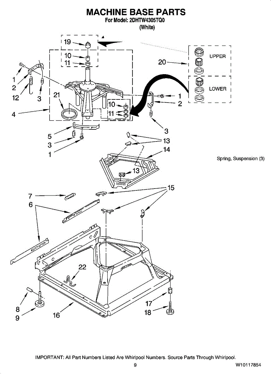 Used for direct drive washing machines. Complete assembly includes 2 level mechanism links, 1 level mechanism spring, 1 knurled pin, 2 rear feet, 1 pad plate, 1 suspension plate, 1 base pad, and 1 suspension spring retainer.