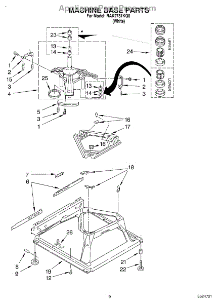 Used for direct drive washing machines. Complete assembly includes 2 level mechanism links, 1 level mechanism spring, 1 knurled pin, 2 rear feet, 1 pad plate, 1 suspension plate, 1 base pad, and 1 suspension spring retainer.
