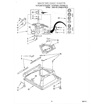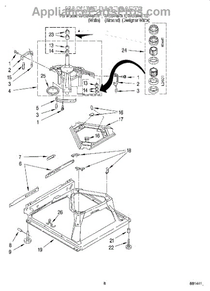 Used for direct drive washing machines. Complete assembly includes 2 level mechanism links, 1 level mechanism spring, 1 knurled pin, 2 rear feet, 1 pad plate, 1 suspension plate, 1 base pad, and 1 suspension spring retainer.