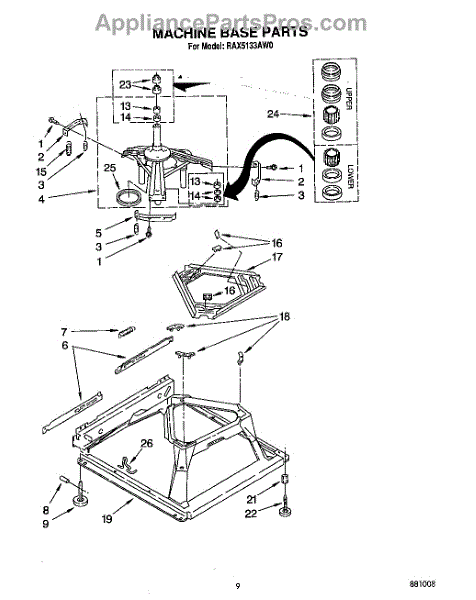 Used for direct drive washing machines. Complete assembly includes 2 level mechanism links, 1 level mechanism spring, 1 knurled pin, 2 rear feet, 1 pad plate, 1 suspension plate, 1 base pad, and 1 suspension spring retainer.