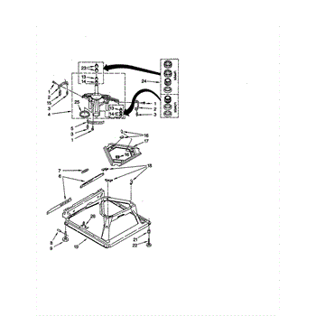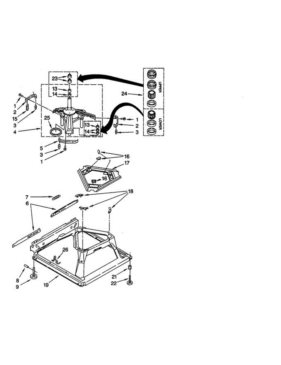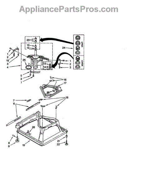 Used for direct drive washing machines. Complete assembly includes 2 level mechanism links, 1 level mechanism spring, 1 knurled pin, 2 rear feet, 1 pad plate, 1 suspension plate, 1 base pad, and 1 suspension spring retainer.