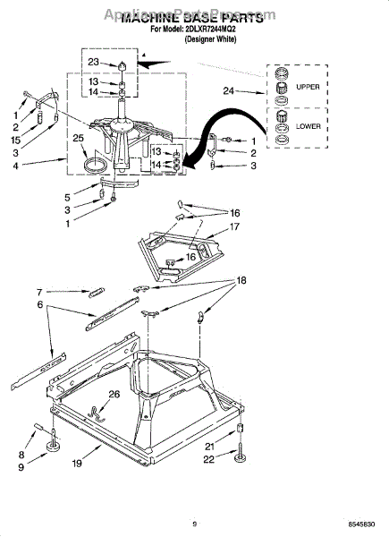 Used for direct drive washing machines. Complete assembly includes 2 level mechanism links, 1 level mechanism spring, 1 knurled pin, 2 rear feet, 1 pad plate, 1 suspension plate, 1 base pad, and 1 suspension spring retainer.