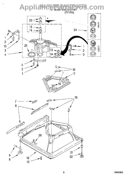 Used for direct drive washing machines. Complete assembly includes 2 level mechanism links, 1 level mechanism spring, 1 knurled pin, 2 rear feet, 1 pad plate, 1 suspension plate, 1 base pad, and 1 suspension spring retainer.