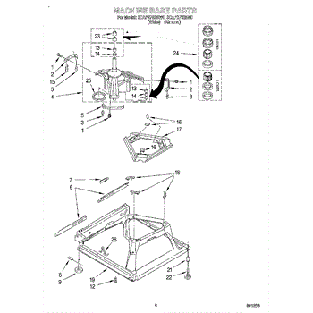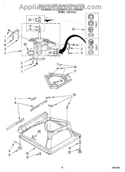 Used for direct drive washing machines. Complete assembly includes 2 level mechanism links, 1 level mechanism spring, 1 knurled pin, 2 rear feet, 1 pad plate, 1 suspension plate, 1 base pad, and 1 suspension spring retainer.
