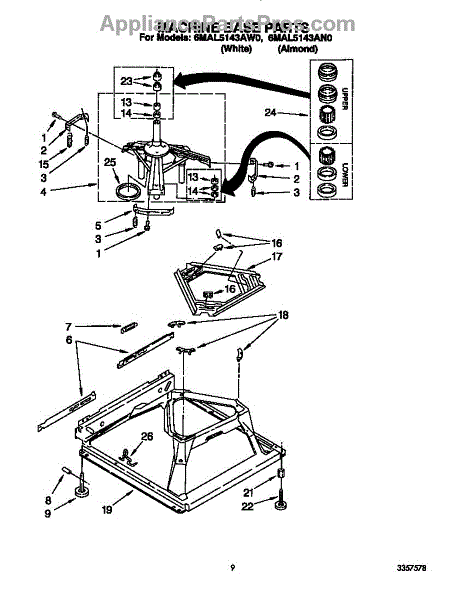 Used for direct drive washing machines. Complete assembly includes 2 level mechanism links, 1 level mechanism spring, 1 knurled pin, 2 rear feet, 1 pad plate, 1 suspension plate, 1 base pad, and 1 suspension spring retainer.