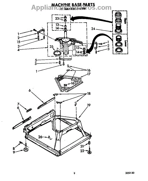 Used for direct drive washing machines. Complete assembly includes 2 level mechanism links, 1 level mechanism spring, 1 knurled pin, 2 rear feet, 1 pad plate, 1 suspension plate, 1 base pad, and 1 suspension spring retainer.