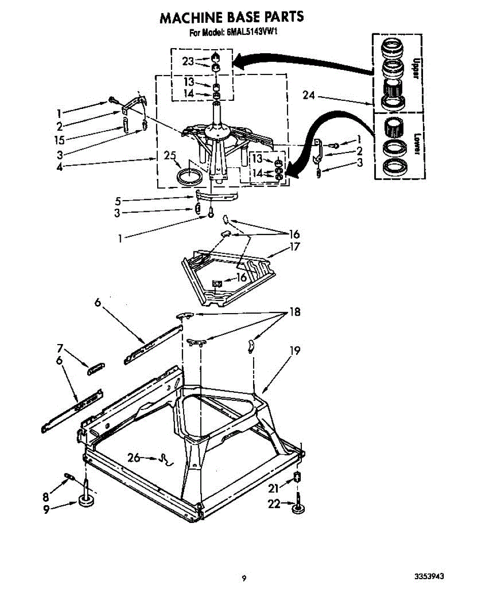 Used for direct drive washing machines. Complete assembly includes 2 level mechanism links, 1 level mechanism spring, 1 knurled pin, 2 rear feet, 1 pad plate, 1 suspension plate, 1 base pad, and 1 suspension spring retainer.