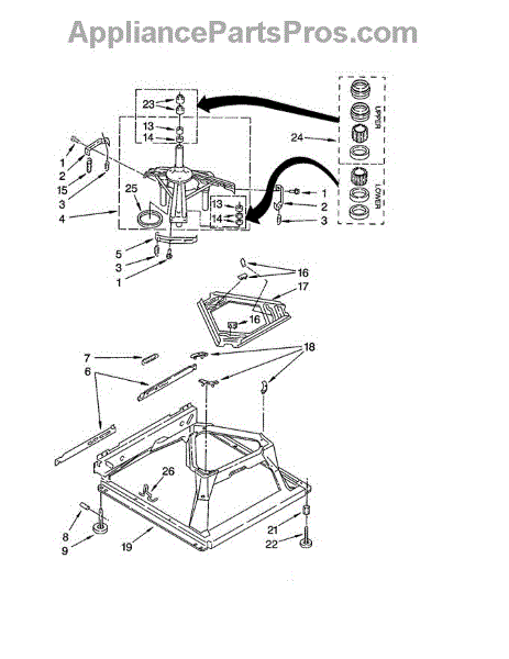 Used for direct drive washing machines. Complete assembly includes 2 level mechanism links, 1 level mechanism spring, 1 knurled pin, 2 rear feet, 1 pad plate, 1 suspension plate, 1 base pad, and 1 suspension spring retainer.