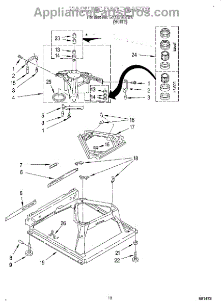 Used for direct drive washing machines. Complete assembly includes 2 level mechanism links, 1 level mechanism spring, 1 knurled pin, 2 rear feet, 1 pad plate, 1 suspension plate, 1 base pad, and 1 suspension spring retainer.