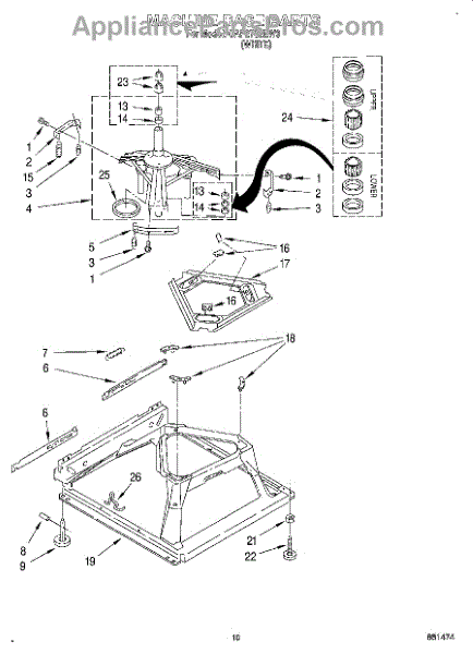 Used for direct drive washing machines. Complete assembly includes 2 level mechanism links, 1 level mechanism spring, 1 knurled pin, 2 rear feet, 1 pad plate, 1 suspension plate, 1 base pad, and 1 suspension spring retainer.