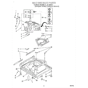 Used for direct drive washing machines. Complete assembly includes 2 level mechanism links, 1 level mechanism spring, 1 knurled pin, 2 rear feet, 1 pad plate, 1 suspension plate, 1 base pad, and 1 suspension spring retainer.