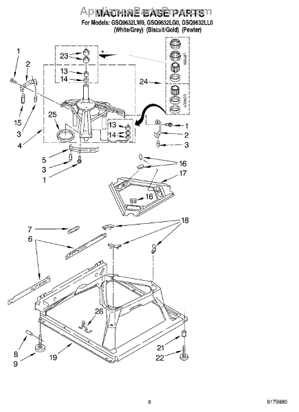 Used for direct drive washing machines. Complete assembly includes 2 level mechanism links, 1 level mechanism spring, 1 knurled pin, 2 rear feet, 1 pad plate, 1 suspension plate, 1 base pad, and 1 suspension spring retainer.