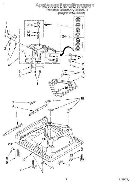 Used for direct drive washing machines. Complete assembly includes 2 level mechanism links, 1 level mechanism spring, 1 knurled pin, 2 rear feet, 1 pad plate, 1 suspension plate, 1 base pad, and 1 suspension spring retainer.