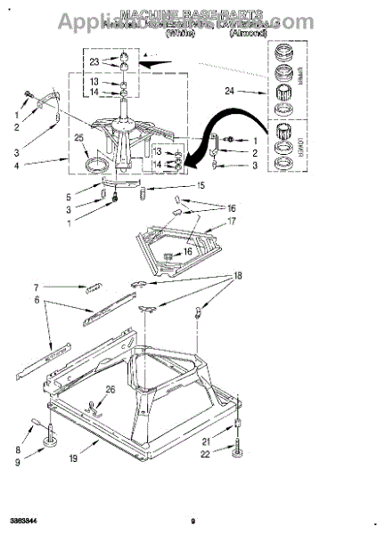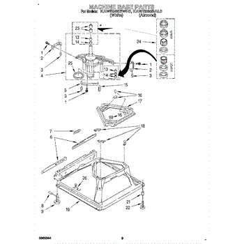 Used for direct drive washing machines. Complete assembly includes 2 level mechanism links, 1 level mechanism spring, 1 knurled pin, 2 rear feet, 1 pad plate, 1 suspension plate, 1 base pad, and 1 suspension spring retainer.
