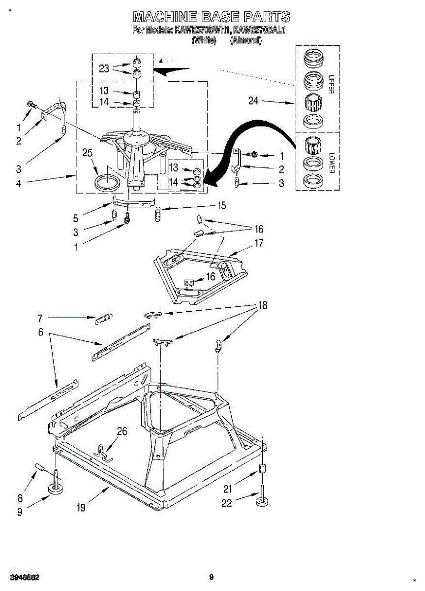 Used for direct drive washing machines. Complete assembly includes 2 level mechanism links, 1 level mechanism spring, 1 knurled pin, 2 rear feet, 1 pad plate, 1 suspension plate, 1 base pad, and 1 suspension spring retainer.