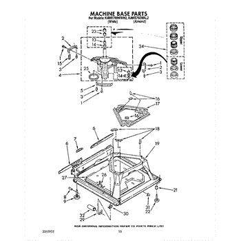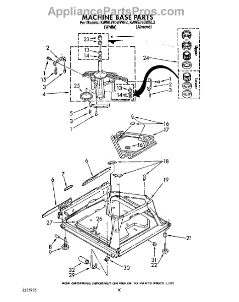 Used for direct drive washing machines. Complete assembly includes 2 level mechanism links, 1 level mechanism spring, 1 knurled pin, 2 rear feet, 1 pad plate, 1 suspension plate, 1 base pad, and 1 suspension spring retainer.