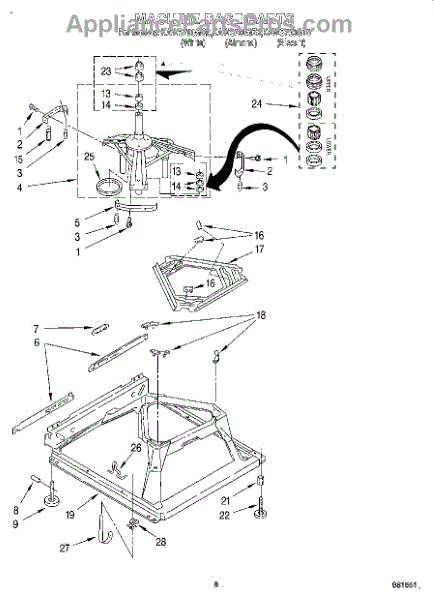 Used for direct drive washing machines. Complete assembly includes 2 level mechanism links, 1 level mechanism spring, 1 knurled pin, 2 rear feet, 1 pad plate, 1 suspension plate, 1 base pad, and 1 suspension spring retainer.