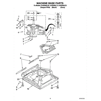 Used for direct drive washing machines. Complete assembly includes 2 level mechanism links, 1 level mechanism spring, 1 knurled pin, 2 rear feet, 1 pad plate, 1 suspension plate, 1 base pad, and 1 suspension spring retainer.