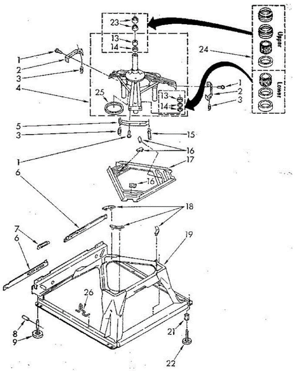 Used for direct drive washing machines. Complete assembly includes 2 level mechanism links, 1 level mechanism spring, 1 knurled pin, 2 rear feet, 1 pad plate, 1 suspension plate, 1 base pad, and 1 suspension spring retainer.