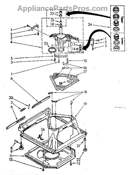 Used for direct drive washing machines. Complete assembly includes 2 level mechanism links, 1 level mechanism spring, 1 knurled pin, 2 rear feet, 1 pad plate, 1 suspension plate, 1 base pad, and 1 suspension spring retainer.