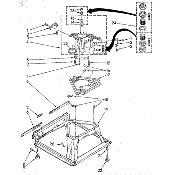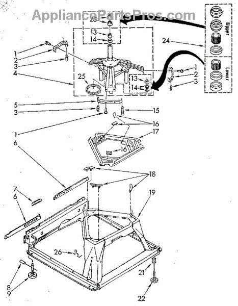 Used for direct drive washing machines. Complete assembly includes 2 level mechanism links, 1 level mechanism spring, 1 knurled pin, 2 rear feet, 1 pad plate, 1 suspension plate, 1 base pad, and 1 suspension spring retainer.
