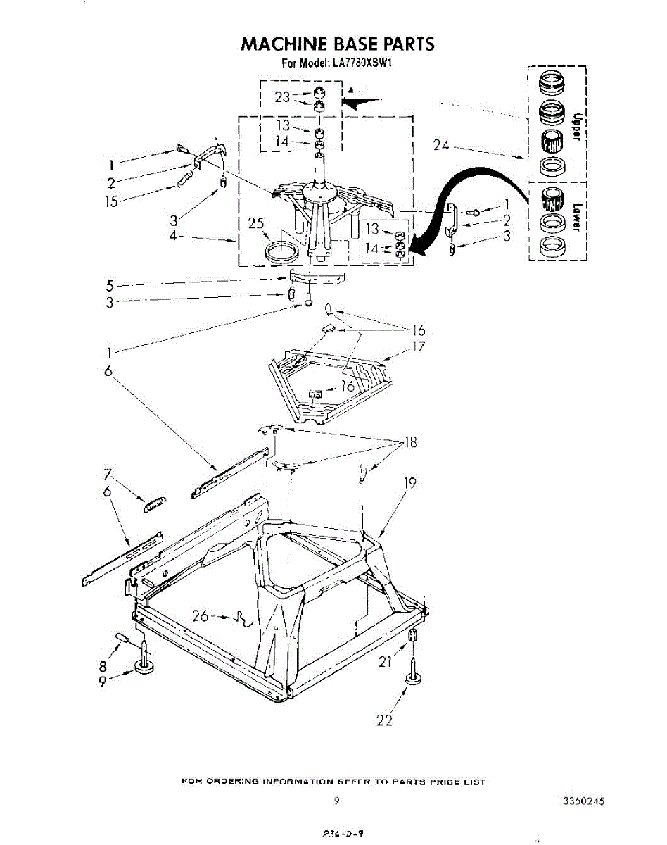Used for direct drive washing machines. Complete assembly includes 2 level mechanism links, 1 level mechanism spring, 1 knurled pin, 2 rear feet, 1 pad plate, 1 suspension plate, 1 base pad, and 1 suspension spring retainer.