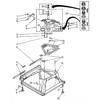 Used for direct drive washing machines. Complete assembly includes 2 level mechanism links, 1 level mechanism spring, 1 knurled pin, 2 rear feet, 1 pad plate, 1 suspension plate, 1 base pad, and 1 suspension spring retainer.