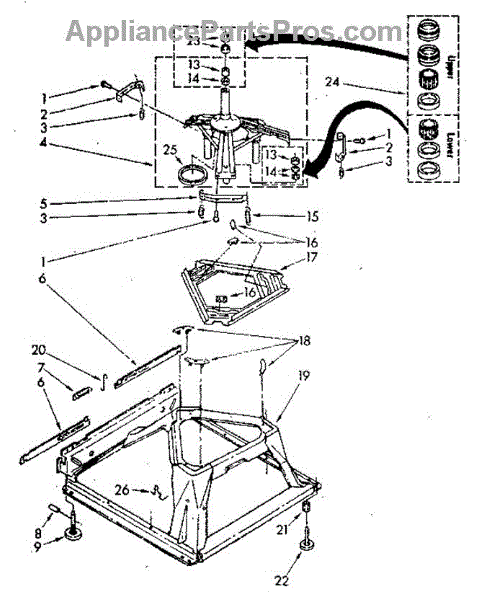 Used for direct drive washing machines. Complete assembly includes 2 level mechanism links, 1 level mechanism spring, 1 knurled pin, 2 rear feet, 1 pad plate, 1 suspension plate, 1 base pad, and 1 suspension spring retainer.