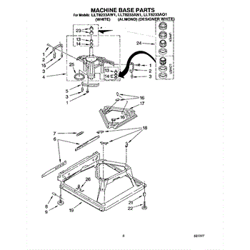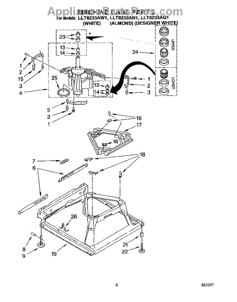Used for direct drive washing machines. Complete assembly includes 2 level mechanism links, 1 level mechanism spring, 1 knurled pin, 2 rear feet, 1 pad plate, 1 suspension plate, 1 base pad, and 1 suspension spring retainer.
