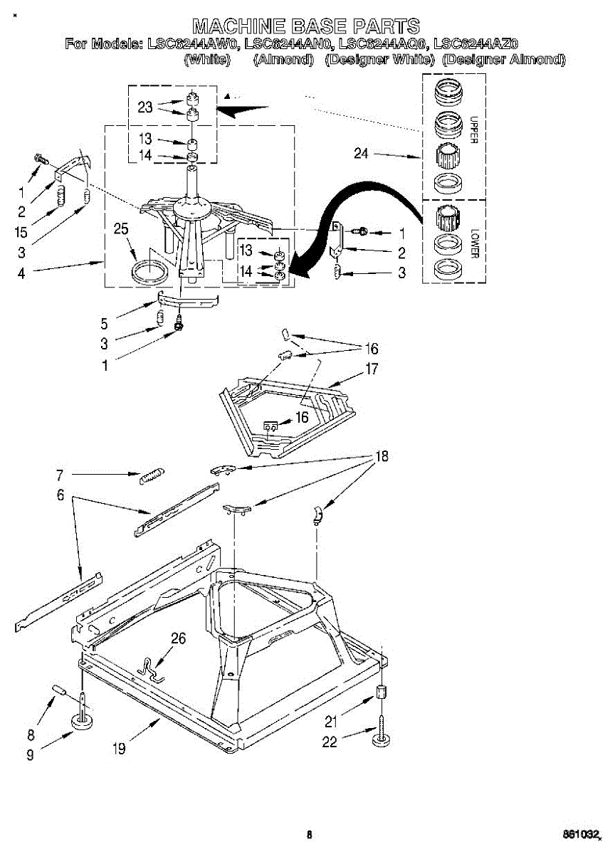 Used for direct drive washing machines. Complete assembly includes 2 level mechanism links, 1 level mechanism spring, 1 knurled pin, 2 rear feet, 1 pad plate, 1 suspension plate, 1 base pad, and 1 suspension spring retainer.