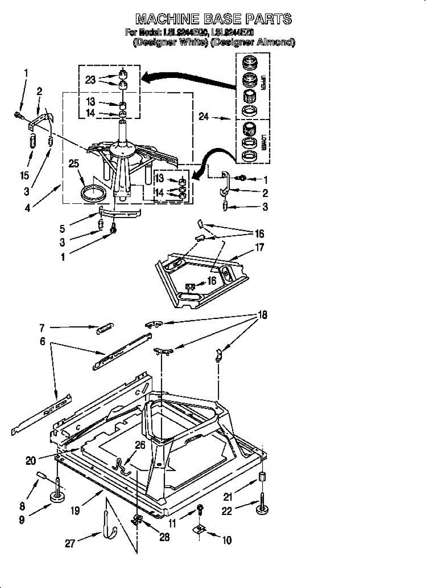 Used for direct drive washing machines. Complete assembly includes 2 level mechanism links, 1 level mechanism spring, 1 knurled pin, 2 rear feet, 1 pad plate, 1 suspension plate, 1 base pad, and 1 suspension spring retainer.