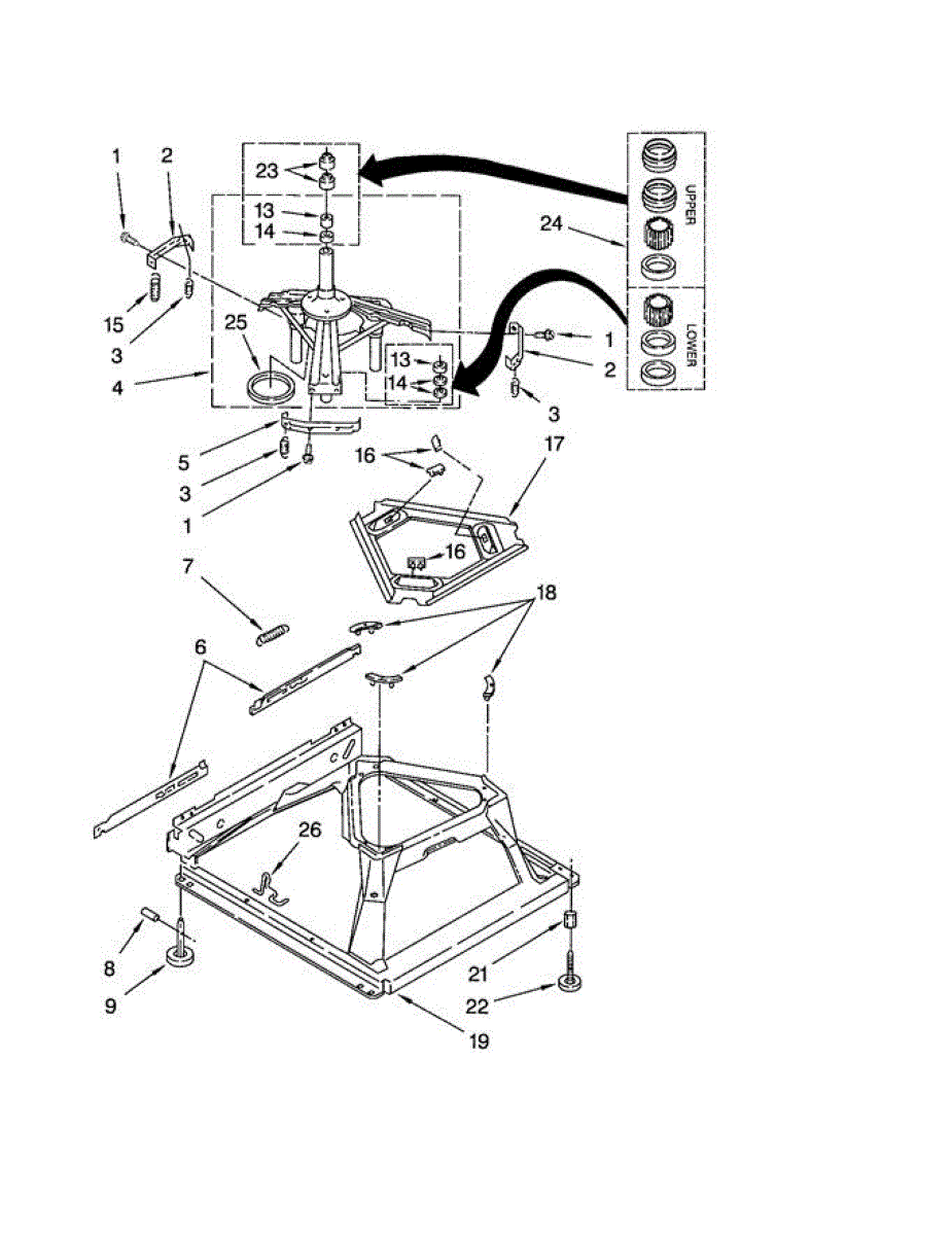 Used for direct drive washing machines. Complete assembly includes 2 level mechanism links, 1 level mechanism spring, 1 knurled pin, 2 rear feet, 1 pad plate, 1 suspension plate, 1 base pad, and 1 suspension spring retainer.