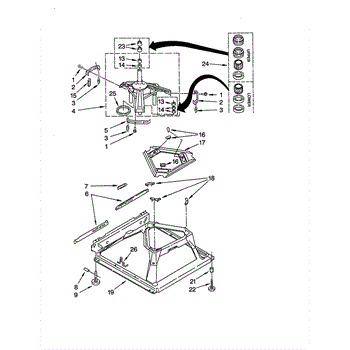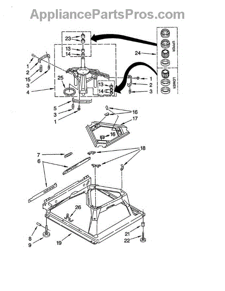 Used for direct drive washing machines. Complete assembly includes 2 level mechanism links, 1 level mechanism spring, 1 knurled pin, 2 rear feet, 1 pad plate, 1 suspension plate, 1 base pad, and 1 suspension spring retainer.