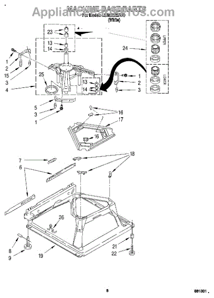 Used for direct drive washing machines. Complete assembly includes 2 level mechanism links, 1 level mechanism spring, 1 knurled pin, 2 rear feet, 1 pad plate, 1 suspension plate, 1 base pad, and 1 suspension spring retainer.
