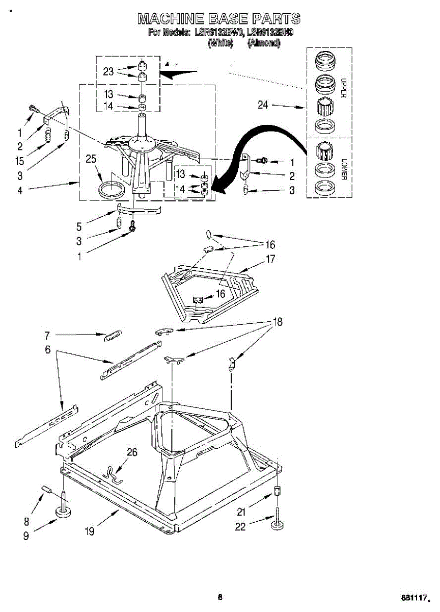 Used for direct drive washing machines. Complete assembly includes 2 level mechanism links, 1 level mechanism spring, 1 knurled pin, 2 rear feet, 1 pad plate, 1 suspension plate, 1 base pad, and 1 suspension spring retainer.