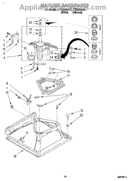Secures suspension springs at the washer base to absorb vibrations. Replace if cracked, worn, or broken to restore proper drum stabilization.